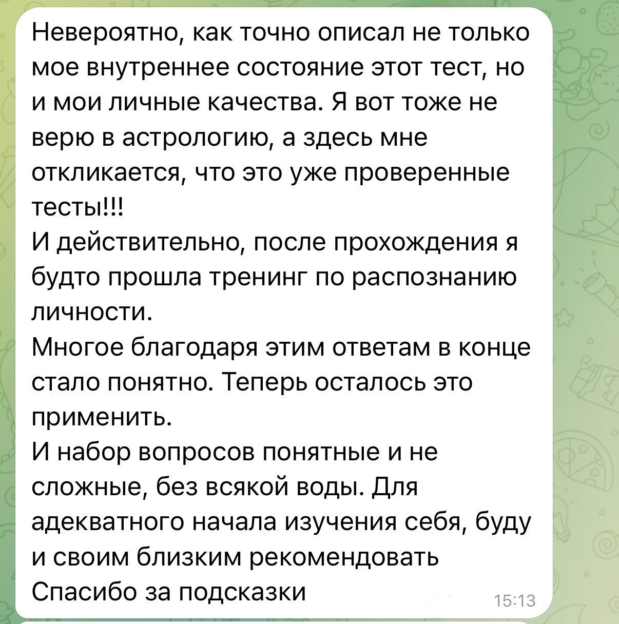 Вы получите глубокий персональный отчёт на 20+ страниц, ИИ-ассистента для разбора результатов, список карьерных направлений наиболее совместимых с вами. А главное — фундамент, на который можно опираться при принятии решений о карьере, отношениях и жизни.